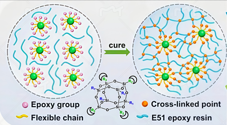 科研团队依托POSS独特的杂化结构——内核为刚性Si-O无机笼型骨架,外缘可精准修饰有机官能团,巧妙构建出“有机-无机”协同的纳米增韧体系。POSS粒径仅1-3纳米,与聚合物链尺寸完美匹配,融无机刚性、热稳定性与有机柔韧性于一体。团队进一步通过分子模拟与结构设计,在POSS八顶点高效接枝聚醚链段,形成高度舒展的杂化架构。该设计一举突破传统增韧中“高韧必低强”的困局,实现了超低温环境下应力均匀分散与抗裂纹扩展能力的双重飞跃。