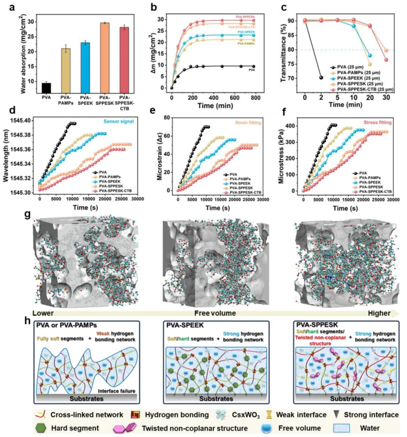 此外,通过光纤光栅传感器(FBG)实时监测涂层中水分引起的应力变化,发现PVA-SPPESK具有更低的峰值应力和延迟响应,证实其优异的长期防雾能力。