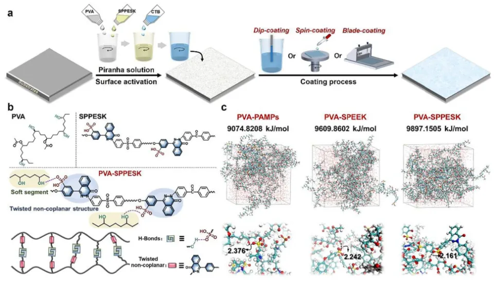 在高湿度环境下,微米/亚微米涂层的防雾耐久性通常有限,这凸显了对稳定表面设计的需求。虽然增加涂层厚度是通过增强吸水性来延长防雾持续时间的常用策略,但这会损害光学清晰度和透射率稳定性。为了解决这个问题,该研究团队以常见的防雾涂层材料聚乙烯醇(PVA)为例,尝试在不改变其厚度的情况下优化其内部涂层结构。该研究团队使用聚乙烯醇(PVA)作为带有羟基(-OH)基团的交联骨架,引入含磺酸基(-SO₃H)的扭曲非共面聚合物链段(如PAMPs、SPEEK ,SPPESK),构建了强氢键交联的亲水涂层系统。该涂层在浸涂、旋涂和刮涂方法中表现出良好的可加工性,可实现多种制造方式。图1展示了该涂层从设计、合成到氢键系统的验证过程。通过分子动力学模拟,研究人员比较了不同链段结构的氢键强度与内聚能,发现PVA-SPPESK系统具有最短的键长和最高的氢键数量,其扭曲结构有效降低了空间位阻,促进了多重氢键的形成,从而显著提升了涂层的亲水性、附着力、透明度以及防雾性能。