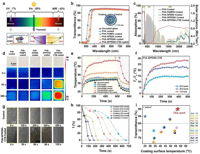 PVA-SPPESK-CTB涂层体系实现了92%的可见光透射率,以及93%的紫外光和51% 的近红外光吸收率。在模拟太阳光照射下,涂层表面温度在3分钟内上升28.5℃,即使在弱光条件下也能有效升温,显著抑制冷凝成核。除雾实验中,涂层在120秒内完全恢复透明,比未处理表面快3.5倍。