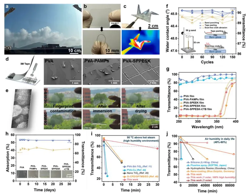涂层的耐久性与实际适用性同样至关重要。图4显示,PVA-SPPESK-CTB防雾涂层可通过简单的浇铸法大规模制备。关于该涂层在柔性基材上适用性的评估结果表明,尽管厚度仅为200μm,但折叠成任意形状不会造成机械损伤或影响光学性能。因此,该涂层可以有效地用在任何柔性、可折叠材料上,同样也可以应用于一些常见的表面,例如窗户、防护罩等。