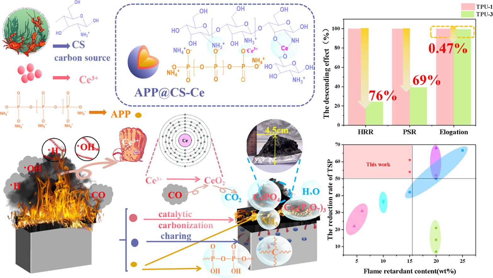 研究人员将壳聚糖(CS)的可再生碳源特性与Ce³⁺的多重催化功能融合到TPU阻燃体系中,通过静电自组装与离子螯合策略,制备了新型阻燃剂APP@CS-Ce。首先,将壳聚糖(CS)在乙酸溶液中质子化形成带正电的聚电解质,继而利用静电自组装将铈离子吸附至带负电的聚磷酸铵(APP)表面,同时铈离子与壳聚糖的氨基(-NH)和羟基(-OH)发生螯合,最终构建出APP@CS-Ce阻燃剂。将APP@CS-Ce与TPU共混后,系统评估了TPU复合材料的热稳定性、阻燃性能、抑烟性能及力学性能,并深入探究了界面结合机制与抑烟阻燃机理。