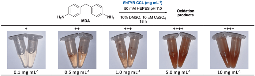 图2 (A)弹性纤维模型基质1a-1f (B)开发 MDA 氧化的 RsTYR 测定法。酶的浓度表示为总重悬浮冻干 CCL 粉末。