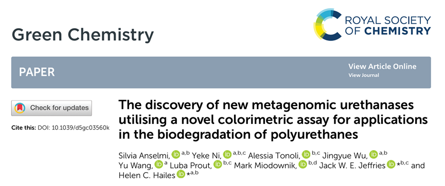 近日,伦敦大学学院Helen C. Hailes教授团队在《Green Chemistry》上发表了题为“The discovery of new metagenomic urethanases utilising a novel colorimetric assay for applications in the biodegradation of polyurethanes”的研究论文。