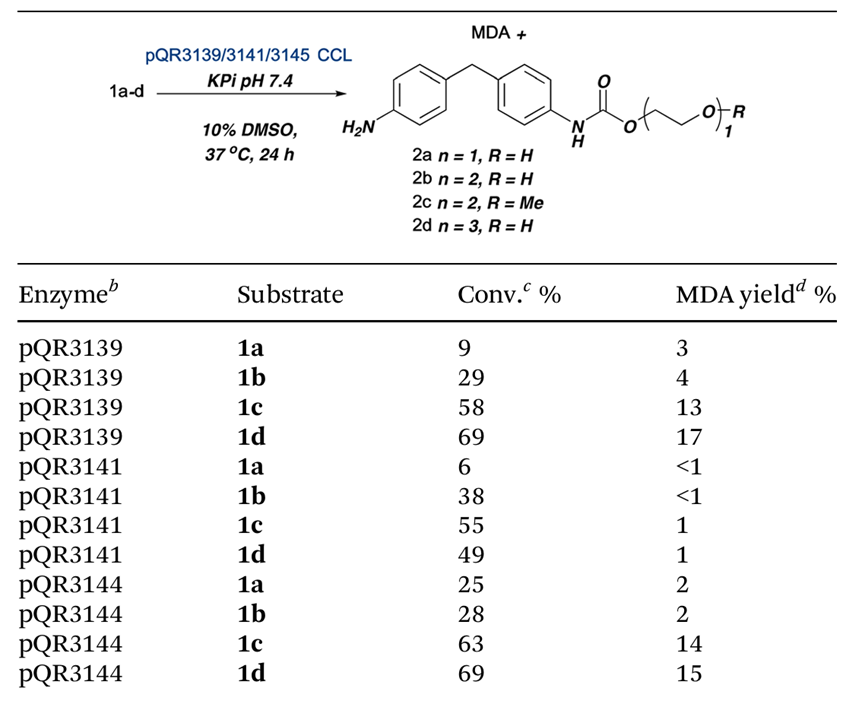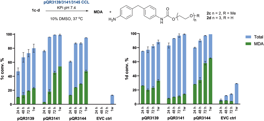 以1c和1d为底物,延长反应时间至7天,三种酶均表现出持续的水解能力,生成MDA及中间体(2a–2d)。其中,pQR3144在反应一周后MDA产率最高(65%),表明其稳定性和催化效率优于其他两种酶。