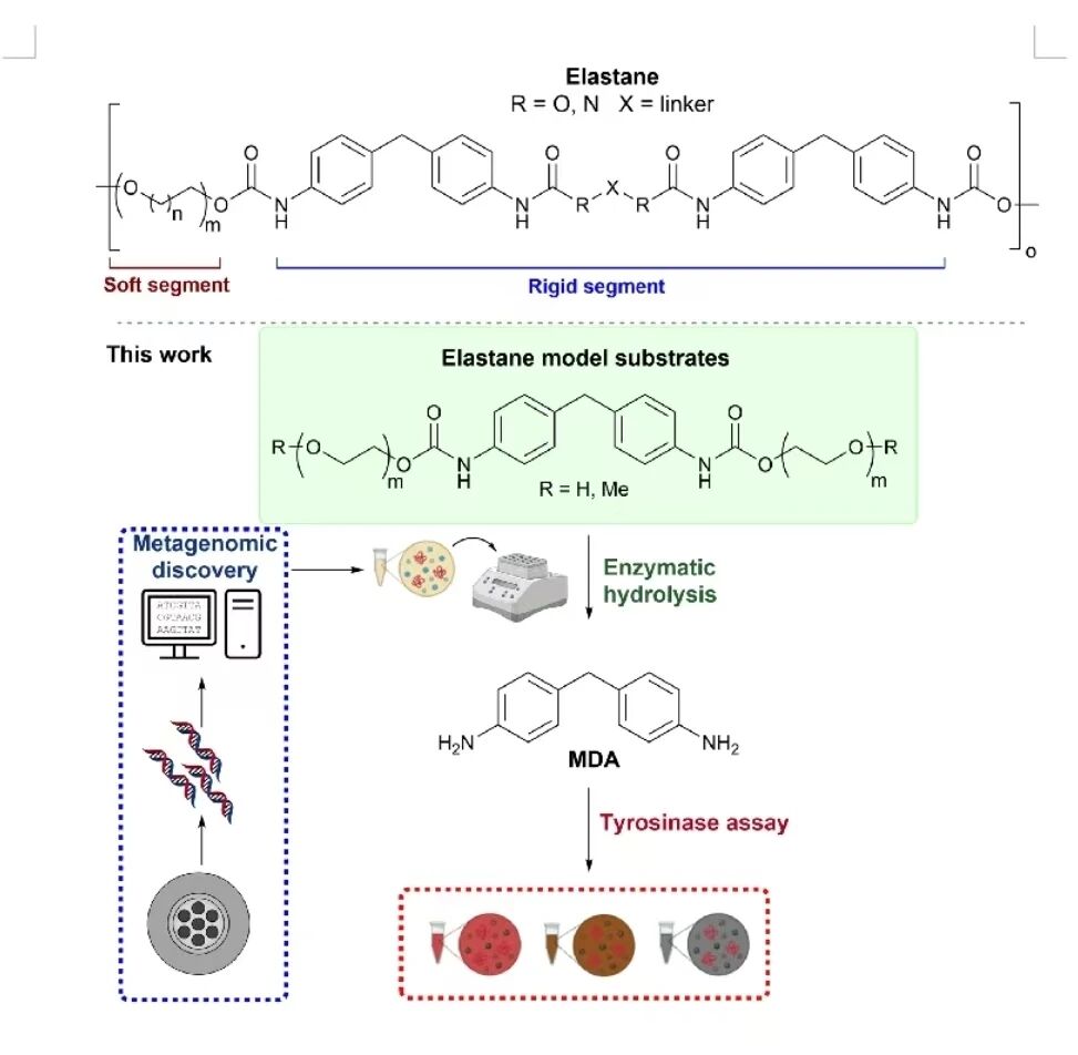 全球塑料污染问题日益严峻,其中纺织品废弃物年产生量高达9200万吨,大部分最终被填埋或进入环境。弹性纤维(Spandex)是聚氨酯(PU)类材料的典型代表,其分子结构由芳香族“硬段”(多以4,4'-亚甲基二苯胺MDA为核心)和柔性的聚醚或聚酯“软段”,这种“软硬段”嵌段结构赋予材料优异的弹性与韧性,导致其在自然条件下极难降解。与PET等聚酯类塑料相比,聚氨酯的生物降解研究仍处于起步阶段,尤其是能断裂氨基甲酸酯键(–NH–COO–)的酰胺酶(urethanase)极为稀少。为此,研究团队以家庭排水系统这一富含蛋白质残渣和多样微生物群的环境为样本来源,构建宏基因组数据库,并设计一种酪氨酸酶辅助的显色测定体系,以实现对潜在聚氨酯水解酶的快速、高通量筛选与验证。