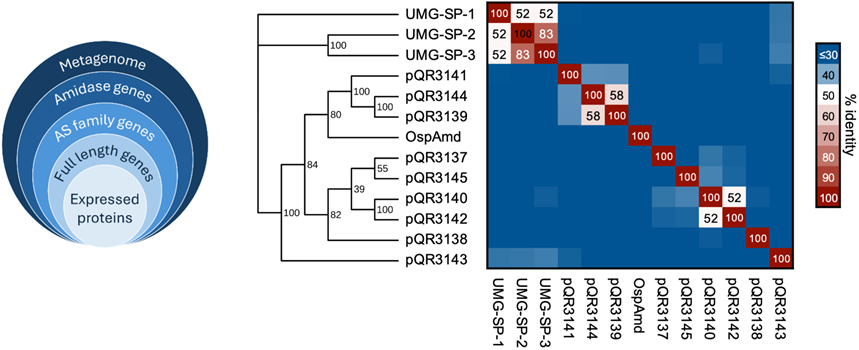 研究团队利用自建的排水系统宏基因组数据库(富含蛋白质残渣与微生物群),通过Pfam数据库搜索含amidase signature(AS)结构域(PF01425)的开放阅读框(ORF)。共识别出46条潜在序列,筛选得到9个完整序列并验证其具备典型的Ser–Ser–Lys催化三联体(pQR3137–pQR3145)。这些基因被克隆至pET-29a(+)载体中表达,随后进行系统发育分析。结果显示,这些新型酶与已报道的UMG-SP系列氨基甲酸酯酶在系统发育树上形成独立分支,提示其可能具备新颖的底物识别位点与催化特征。