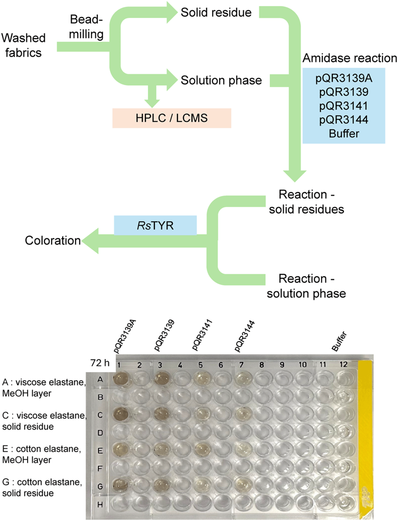 本研究通过整合宏基因组挖掘、酶学筛选与应用验证,系统地实现了聚氨酯降解酰胺酶的发现与功能鉴定。研究团队从家庭排水系统宏基因组中成功挖掘出三种新型酰胺酶(pQR3139、pQR3141、pQR3144),并证实其对MDA型聚氨酯模型底物具有显著水解活性;同时,开发出基于酪氨酸酶氧化显色反应的高通量颜色测定法,实现了酰胺酶活性的快速筛选与定性检测。进一步地,研究在经球磨与纤维素酶预处理的商业织物体系中验证了这些酶的降解能力,成功实现了聚氨酯弹性纤维的生物降解。该成果不仅拓展了聚氨酯及其他难降解高分子材料的生物降解酶资源库,也建立了“宏基因组挖掘—酶显色筛选—实体降解验证”的一体化研究策略,为未来通过酶工程与代谢途径优化提升聚氨酯降解效率提供了新方向,并为混合纺织品的分子级循环利用奠定了重要基础。