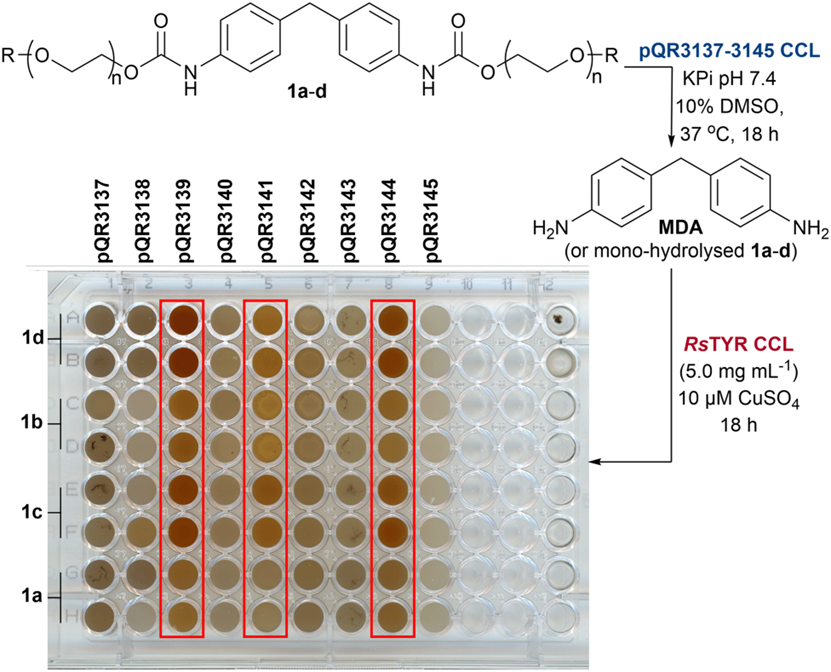 图4 与pQR3139、3141和3144进行1cd的时间点反应。使用酶作为CCL,总蛋白浓度为20 mg mL−1,酶含量为10%,反应进行24、48和72小时和1周,重复进行。