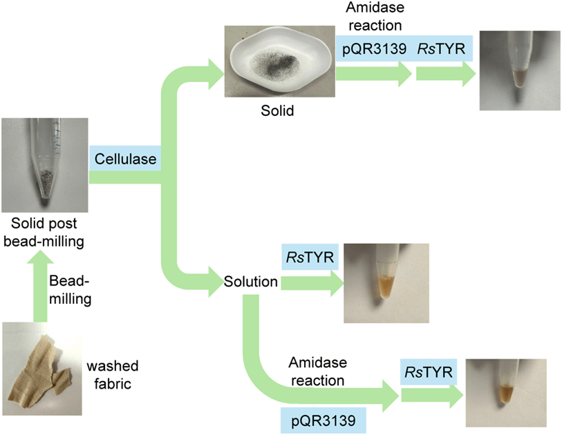 图 5 商业织物(粘胶/弹性纤维、棉/弹性纤维)酶法降解工作流程,包括洗涤、球磨、纤维素酶预处理、酰胺酶处理及颜色测定。
