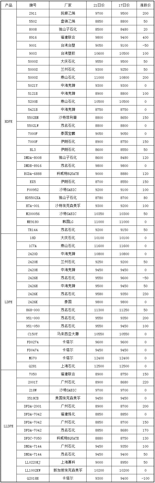 美金价格:亚洲HDPE市场价格以稳为主。最新报价:拉丝料在1099-1101美元/吨(CFR中国),1119-1121美元/吨(CFR东南亚),均持稳;注塑料在1019-1021美元/吨(CFR中国),1039-1041美元/吨(CFR东南亚),均持稳;膜料在1079-1081美元/吨(CFR中国),持稳,1099-1101美元/吨(CFR东南亚),上涨10美元/吨;吹塑料在1059-1061美元/吨(CFR中国),1079-1081美元/吨(CFR东南亚),均上涨20美元/吨。亚洲LDPE市场价格上涨。最新报价在1129-1131美元/吨(CFR中国),1159-1161美元/吨(CFR东南亚),均上涨10美元/吨。亚洲LLDPE市场价格上扬。最新报价在1069-1071美元/吨(CFR中国),上扬20美元/吨,1089-1091美元/吨(CFR东南亚),上扬10美元/吨。
